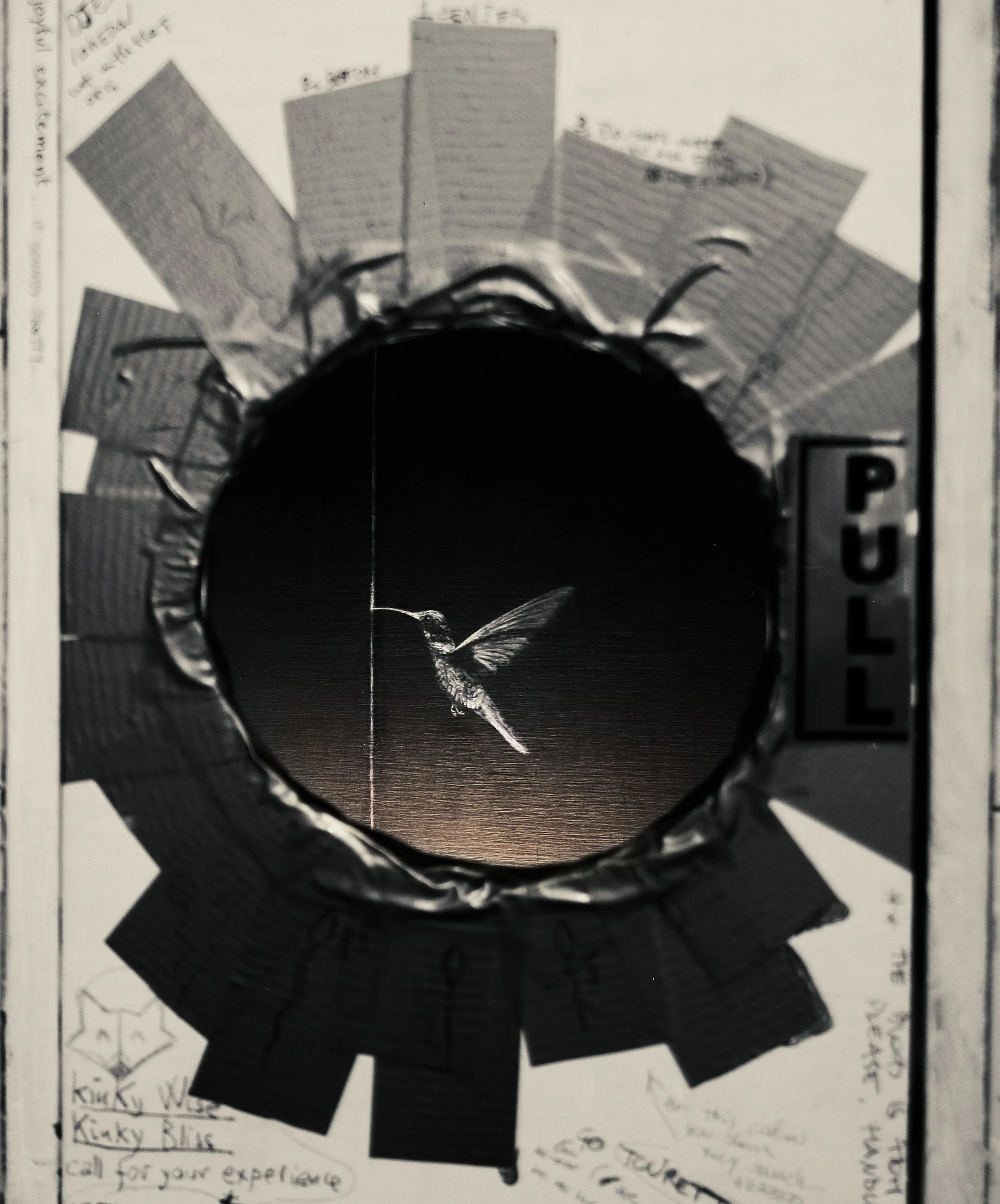 This is a box that contains the painting "Glarehole". It is made of pine wood, ceramic tiles, and duck tape. It has wheels, and a movement detector light inside